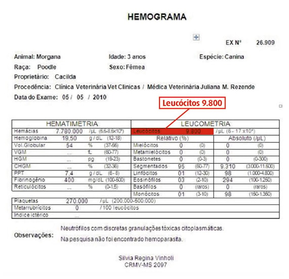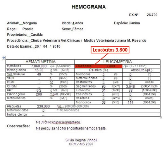 Em 20 de abril de 2012, Morgana foi levada a clínica veterinária, no exame físico o animal se apresentava normal, a veterinária responsável solicitou um hemograma. O exame detectou leucopenia como mostra detalhe da figura 1.