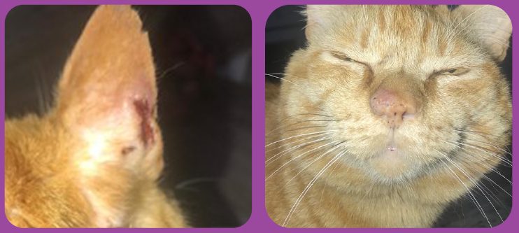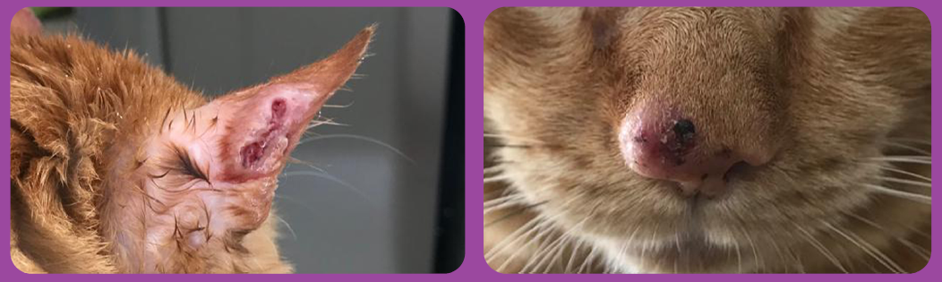 O animal foi levado para consulta por apresentar lesão crônica atrás da orelha e no focinho (figura 1 e 2).