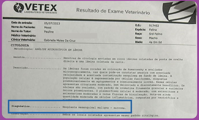 Após exames clínicos, a veterinária solicitou citologia das lesões. O diagnóstico foi de Neoplasia Mesenquimal Maligna - Sarcoma (figura 3).
