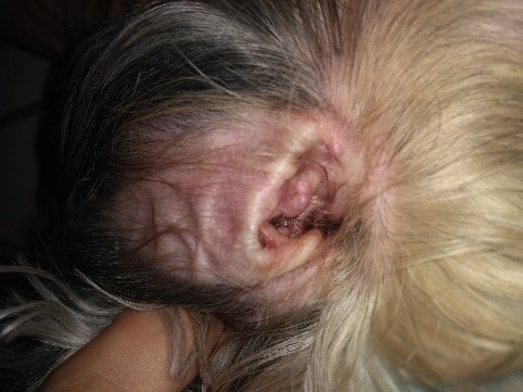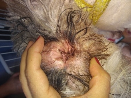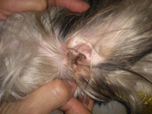 Exame físico: Observou-se ouvido esquerdo levemente irritado, enquanto que o ouvido direito apresenta secreção enegrecida, edemaciado e avermelhado. Odor forte nos dois ouvidos, animal reclamou muito ao toque, no exame do ouvido direito tentou morder. Demais parâmetros dentro dos valores de normalidade, (figuras 01 e 02).