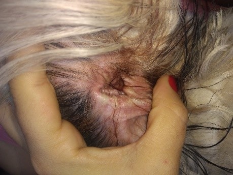 Histórico: Animal foi atendido em 16/11/18 apresentando prurido nos dois ouvidos, sendo grave do lado direto. A proprietária relatou que o animal apresentava o quadro há mais de um mês e sempre que vai para banho, a banhista comenta que o animal está com muita secreção auricular.