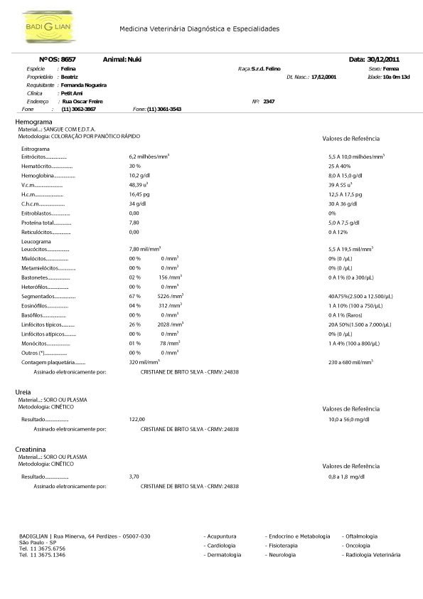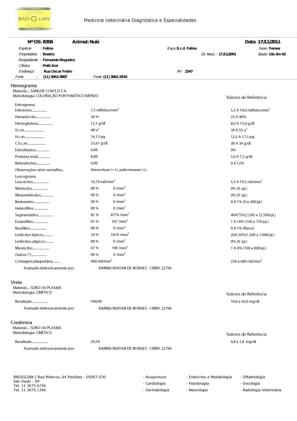 Terapêutica: O tratamento foi estabelecido após o resultado dos exames. Foi instituído fluidoterapia endovenosa diariamente durante seis dias, associado a este tratamento recomendou-se o uso do Homeo Pet Pró-Rim® 1 borrifada 4 vezes ao dia.Evolução: Após poucos dias o animal apresentou melhora clínica, a temperatura que antes estava 35,6°C aumentou para 37,8°C. Após seis dias (23.12.2011) de tratamento os exames foram refeitos, o hemograma continuava normal e os valores de uréia diminuíram para 147mg/dL e creatinina diminuiu para 5,20mg/dL.