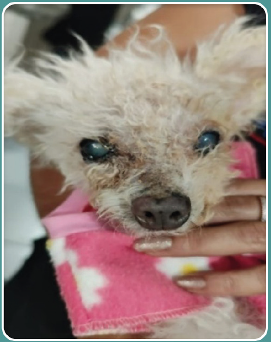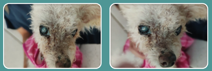 O animal deu entrada na clínica em 04/04/2023, apresentando histórico de conjuntivite e catarata, além de secreção ocular (figuras 1 e 2). A tutora relata que ela bate contra os móveis ao andar pela casa e acaba se ferindo.