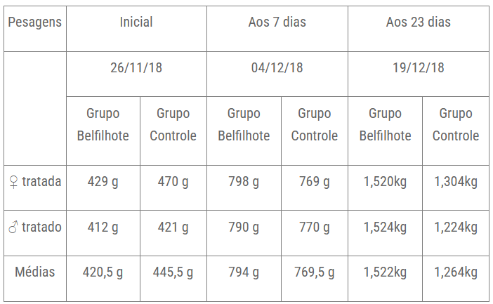 Este trabalho demonstra que o produto Belfilhote é eficiente no estímulo do desenvolvimento dos animais, além de promover melhora na imunidade e fortalecimento dos filhotes.